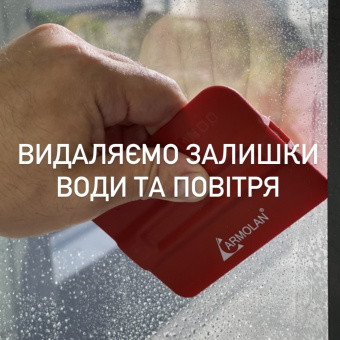 6. За допомогою ракелю з червоним поліуретаном розгладьте плівку і ретельно виженіть залишки води та повітря з-під плівки від центру скла до країв.