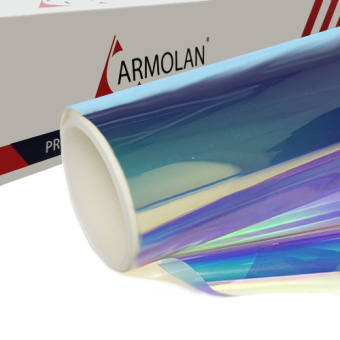 Armolan Dichroic 50% Blue - тонувальна плівка з ефектом хамелеона від преміального бренду Armolan (США). Завдяки своїм дихроїчним і хамелеоноподібним властивостям, плівка змінює відтінок і колір залежно від кута огляду. Колір змінюється залежно від кута огляду та освітлення і відображає різні кольори, відбиття та пропускання світла. Плівка хамелеона виготовляється шляхом накладання сотень шарів поліефірної плівки за допомогою технології спів-екструзії, тому має унікальний магічний ефект зміни кольору, вона випромінює вишукане райдужне мерехтіння. Зміна кольору в Dichroic 50% Blue - відбувається у холодних тонах, а в Dichroic 60% Yellow - в теплих.