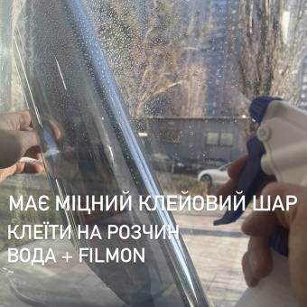 4. Плёнка клеится на мыльный раствор ( в пропорции 5-10 капель концентрату Film-On на один литр воды). Для нанесения мыльного раствора используйте обычный распылитель.