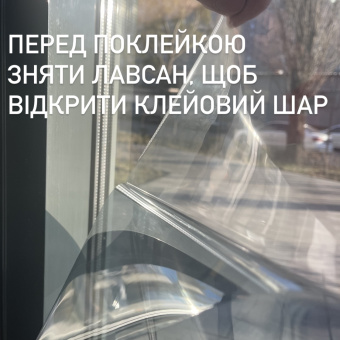 5. Снимите с плёнки защитный слой (лавсан). Смочите с распылителя клеевой слой мыльным раствором и приложите пленку клеевым слоем на мокрую поверхность стекла. Выставьте пленку в нужном положении.